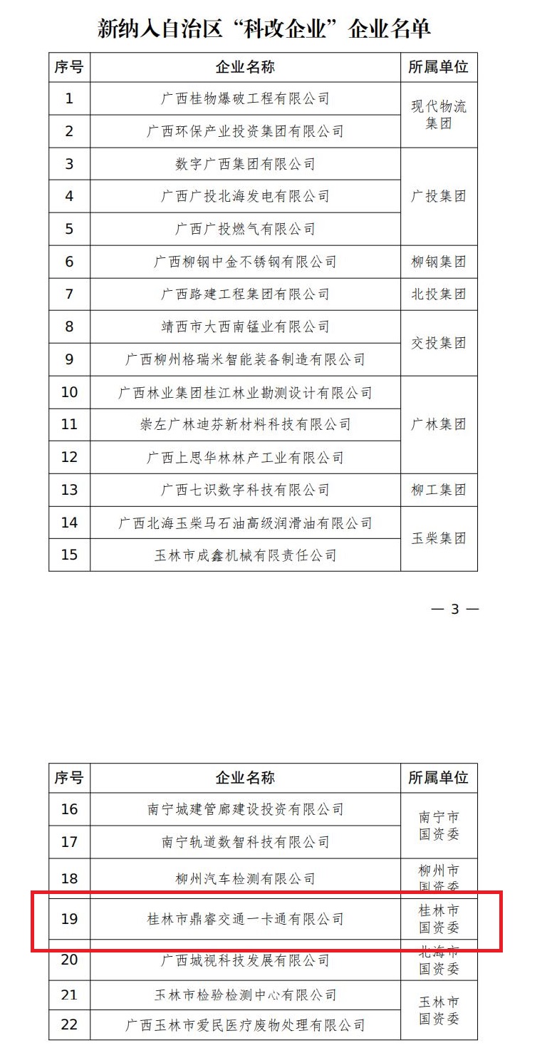 近日,為全面落實(shí)國有企業(yè)改革深化提升行動(dòng)各項(xiàng)要求,推動(dòng)更多企業(yè)通過“科改行動(dòng)”深化市場化改革,自治區(qū)國資委發(fā)布了關(guān)于充實(shí)擴(kuò)圍自治區(qū)“科改企業(yè)”的通知,并公布了新納入“科改企業(yè)”企業(yè)名單,桂林投資集團(tuán)下屬的鼎睿交通一卡通有限公司榜上有名,獲批納入自治區(qū) “科改企業(yè)” 企業(yè)名單。