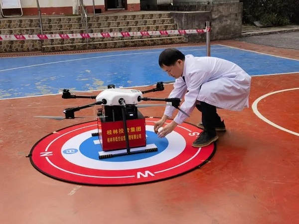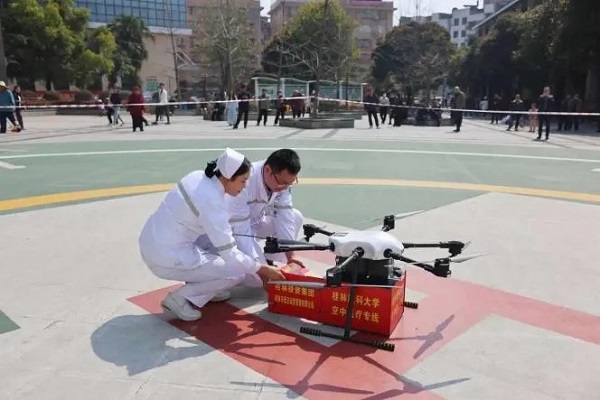 試飛當(dāng)日,搭載著急需醫(yī)療藥品的小型無(wú)人機(jī)從桂林醫(yī)科大學(xué)附屬醫(yī)院樂(lè)群院區(qū)起飛,分別精準(zhǔn)降落至桂林醫(yī)科大學(xué)一附院漓東院區(qū)、桂林醫(yī)科大學(xué)二附院指定地點(diǎn),較傳統(tǒng)陸路運(yùn)輸效率提升6倍。