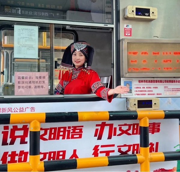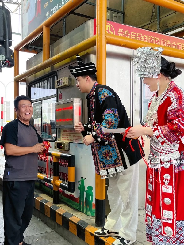 活動(dòng)現(xiàn)場(chǎng),機(jī)場(chǎng)路收費(fèi)站工作人員身著五彩斑斕的民族服飾驚艷亮相,銀飾叮當(dāng)間盡顯民族風(fēng)情。當(dāng)司乘人員駕車駛?cè)胧召M(fèi)站,迎面而來(lái)的不僅是熱情的微笑,更是繡著壯錦紋樣的文化展示。工作人員將繡球、壯錦香囊等非遺手作遞到司乘手中時(shí)總會(huì)附上一句 “歡迎來(lái)到桂林”,讓遠(yuǎn)道而來(lái)的游客第一時(shí)間感受到“桂林山水甲天下,道路服務(wù)更暖心” 的待客之道。