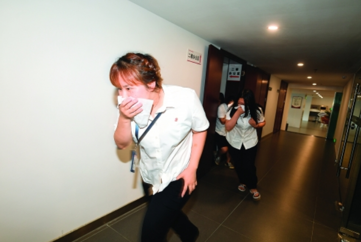 企業(yè)員工模擬火災(zāi)發(fā)生后,用濕紙巾捂住口鼻,彎著腰迅速?gòu)奶由鷮S猛ǖ莱冯x。