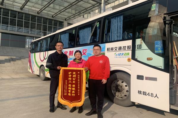 12月23日,桂林理工大學(xué)老師代表該校全體師生將一面印有“定制公交 便捷出行 護(hù)學(xué)路上 感謝有您”的錦旗送至公交集團(tuán),對(duì)定制公交工作人員為學(xué)生考試保駕護(hù)航表示感謝。