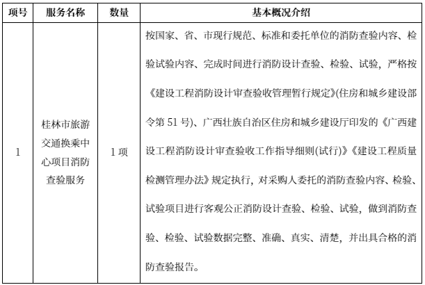 一、項(xiàng)目名稱:桂林市旅游交通換乘中心項(xiàng)目消防查驗(yàn)服務(wù)