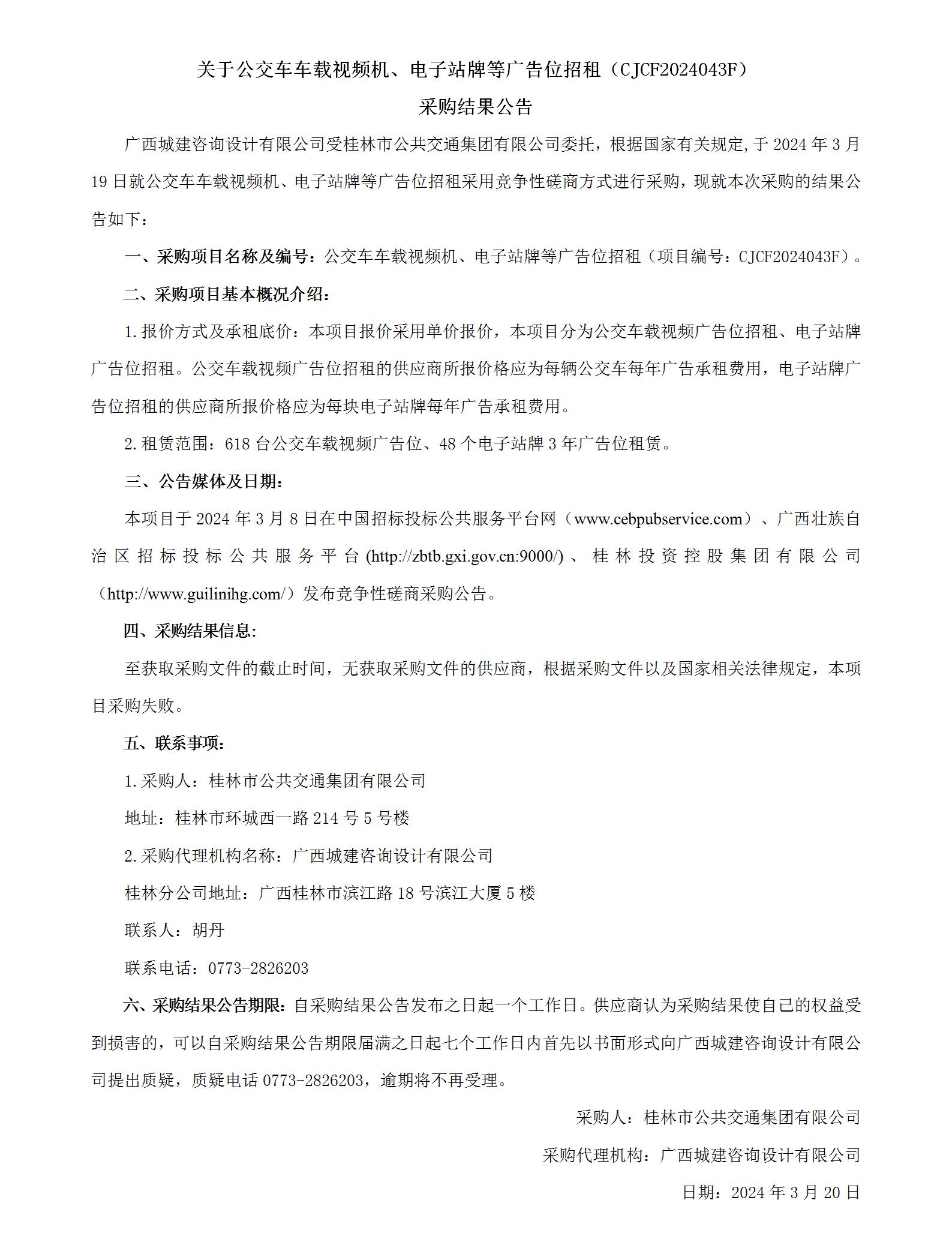 關(guān)于公交車車載視頻機(jī)、電子站牌等廣告位招租(CJCF2024043F) 采購(gòu)結(jié)果公告