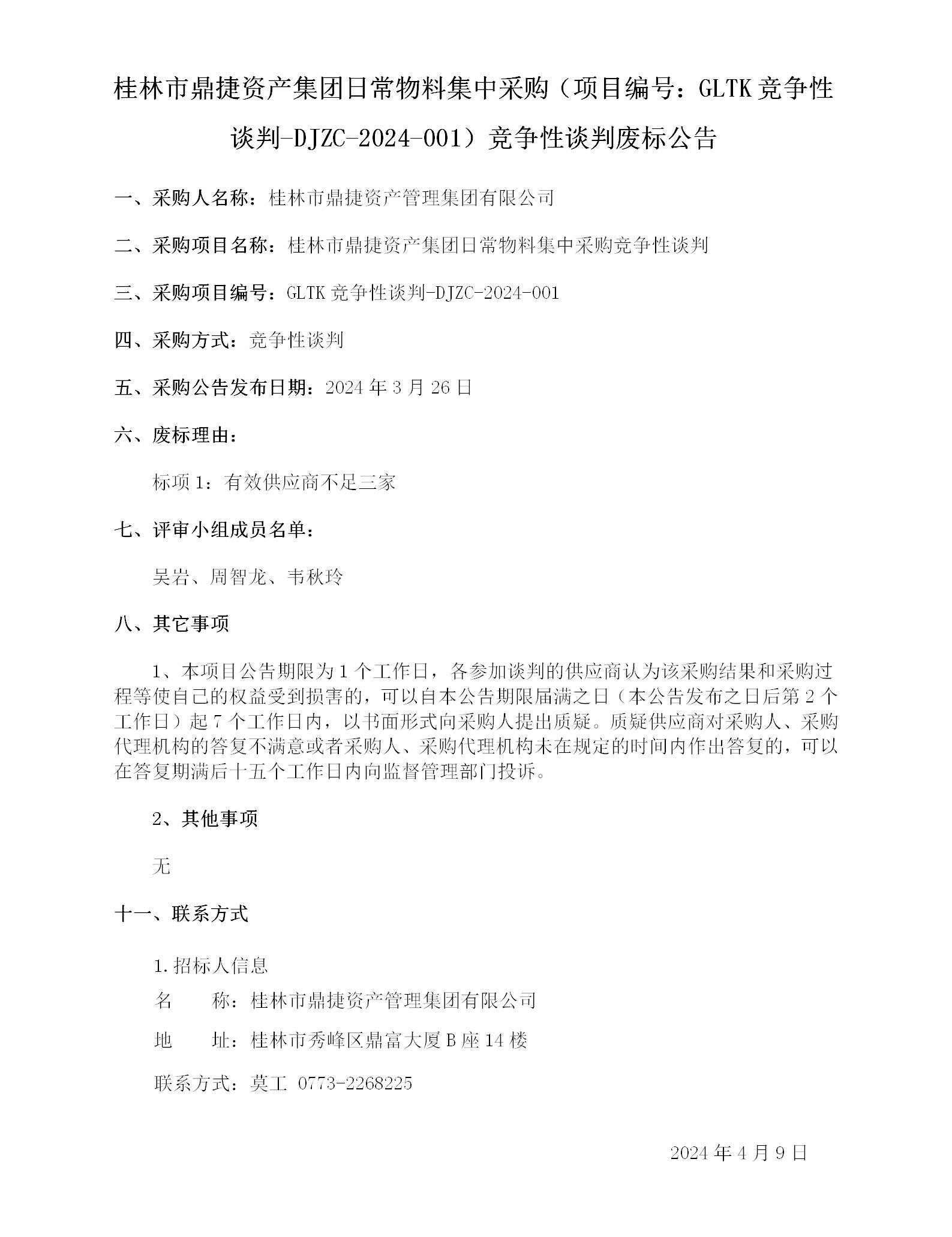 桂林市鼎捷資產(chǎn)集團(tuán)日常物料集中采購(項(xiàng)目編號(hào):GLTK競爭性談判-DJZC-2024-001)競爭性談判廢標(biāo)公告