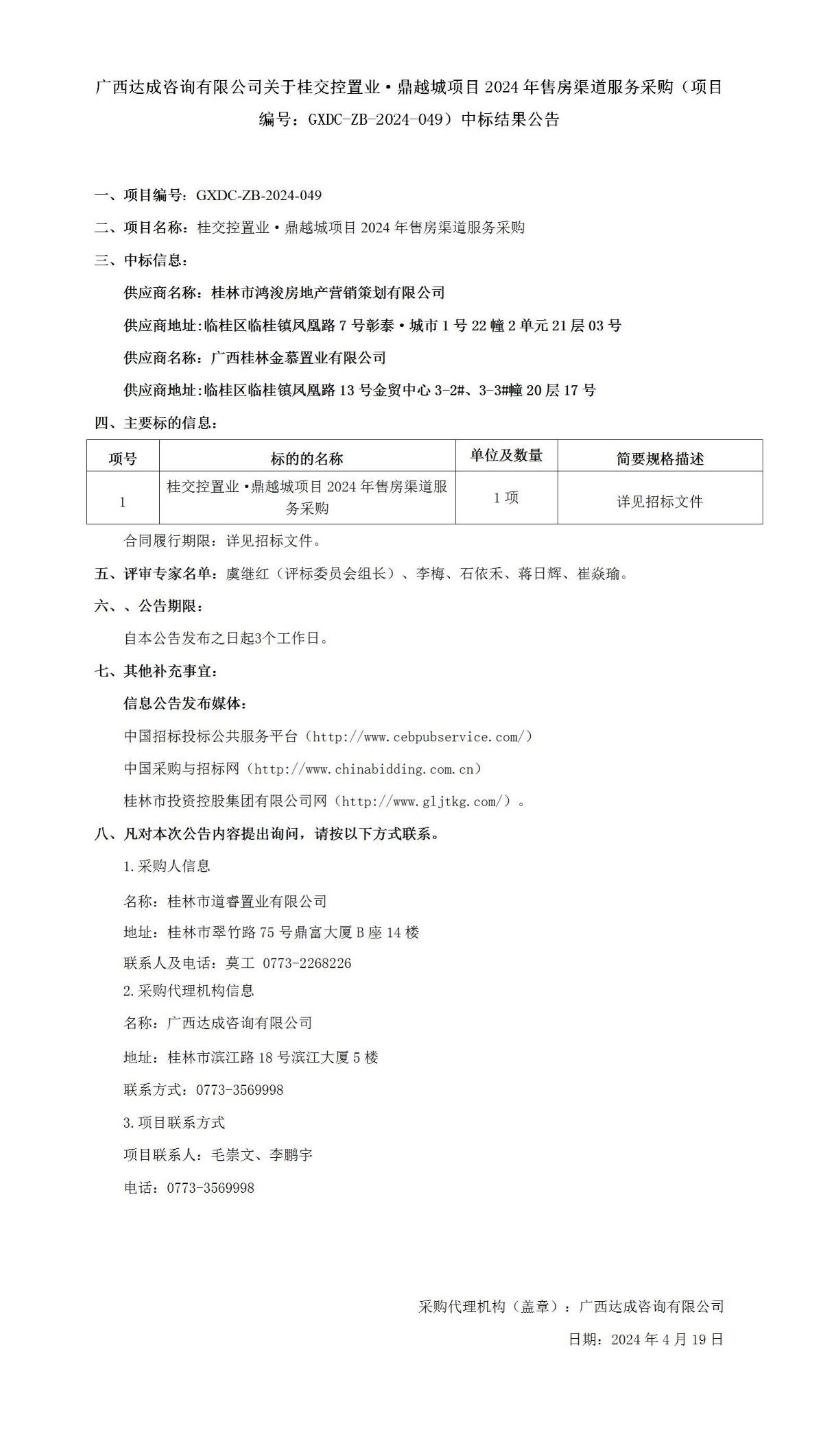 廣西達(dá)成咨詢有限公司關(guān)于桂交控置業(yè)·鼎越城項(xiàng)目2024年售房渠道服務(wù)采購(項(xiàng)目編號:GXDC-ZB-2024-049)中標(biāo)結(jié)果公告