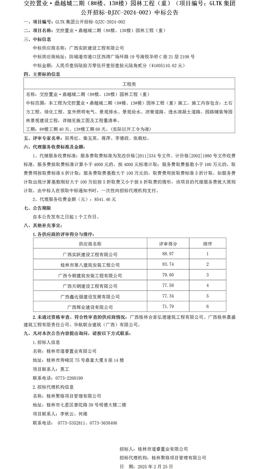 交控置業(yè)·鼎越城二期(8#樓、13#樓)園林工程(重)(項目編號:GLTK集團公開招標(biāo)-DJZC-2024-002)中標(biāo)公告