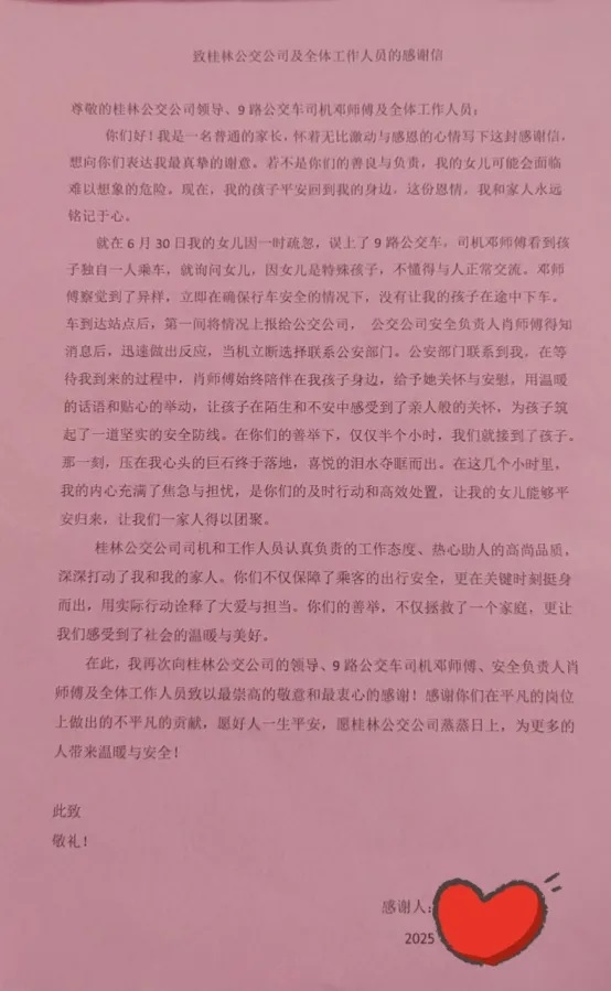 近日在桂林投資集團公交鐵西車場,市民鐘先生夫婦緊緊握著9路駕駛員鄧雪崗的手,錦旗上“公交為愛停駐 溫情助童歸家”的燙金大字在陽光下熠熠生輝。這場溫暖的重逢,源于6月30日那個緊張而又充滿溫情的“半小時”,鄧師傅用職業(yè)敏感與果斷行動,為一名走失女孩筑起了一道“移動的安全防線”。