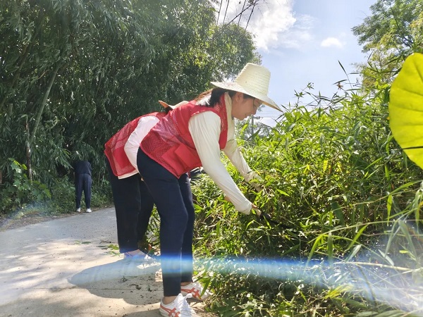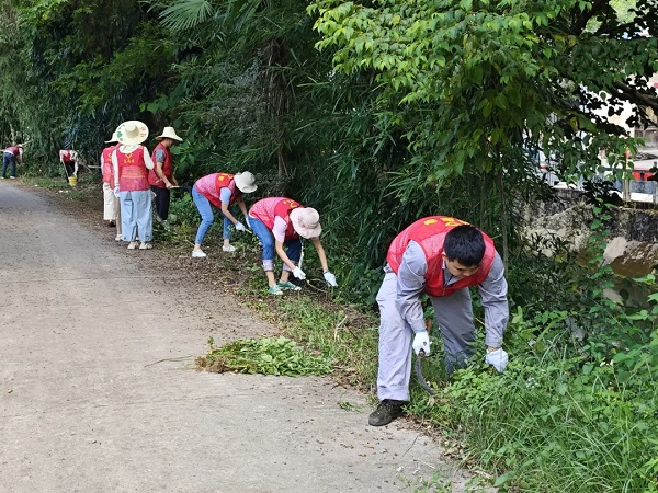 實干是最有力的擔(dān)當(dāng)。清理現(xiàn)場熱火朝天:一組黨員分工協(xié)作,手持鐮刀清理路邊雜草,遇到頑固草根直接徒手拔除,汗水浸透衣背也毫不停歇;另一組則專注清淤,手握鐵鍬深入溝渠,徹底鏟除積水和淤泥,不放過任何一處衛(wèi)生死角。還有隊員拎著垃圾袋沿途細致?lián)焓?,從塑料瓶到碎紙屑,就連墻角縫、草叢深處的雜物都不遺漏?!耙寰颓鍙氐祝荒茉僮尨迕駷檫@些煩心!”勞動間隙,志愿者們還與村民親切交談。貼心的話語、忙碌的身影,讓這個普通的清晨充滿了溫度。