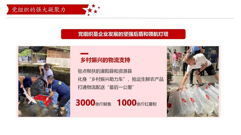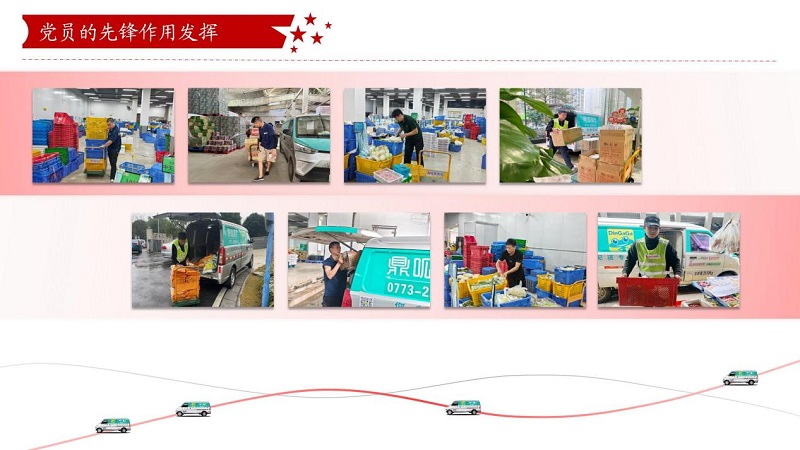 鼎和晟供應(yīng)鏈黨支部把小組建在車隊,團結(jié)帶領(lǐng)全體員工沖鋒在前、勇挑重擔,在鄉(xiāng)村振興、抗洪救災(zāi)等重大任務(wù)中形成了強大的凝聚力和戰(zhàn)斗力。在集團公司駐點幫扶的灌陽縣新街鎮(zhèn)上甫村,“鼎呱呱”新能源物流車化身“鄉(xiāng)村振興助力車”,搶運生鮮農(nóng)產(chǎn)品,打通物流配送“最后一公里”;在“6·19”特大洪澇災(zāi)害中,鼎和晟供應(yīng)鏈秒變“突擊隊”,克服困難配送物資,讓市民喝上“放心水”、吃上“放心菜”,進一步體現(xiàn)了企業(yè)的責任和擔當。